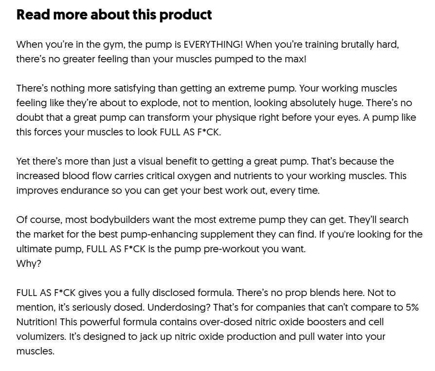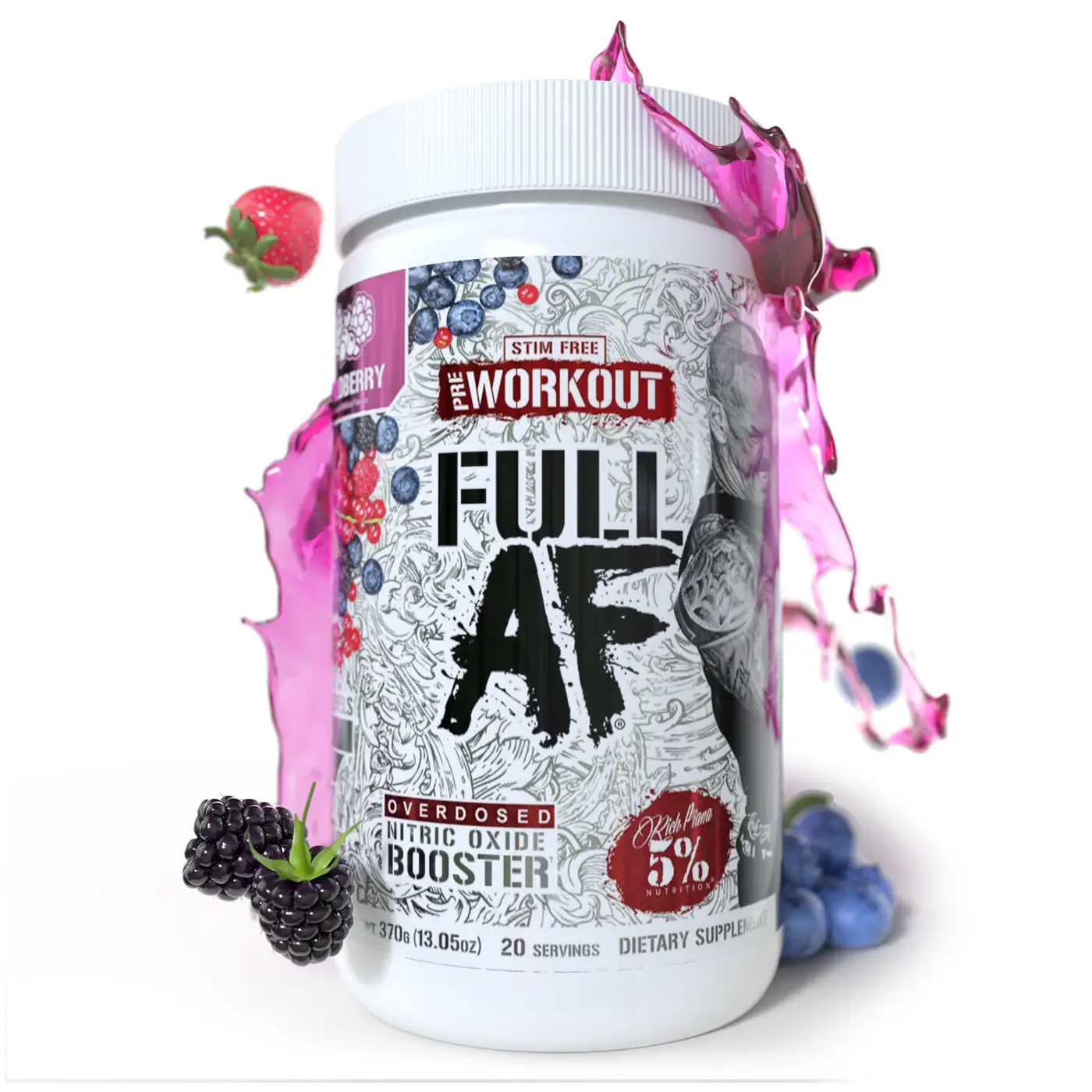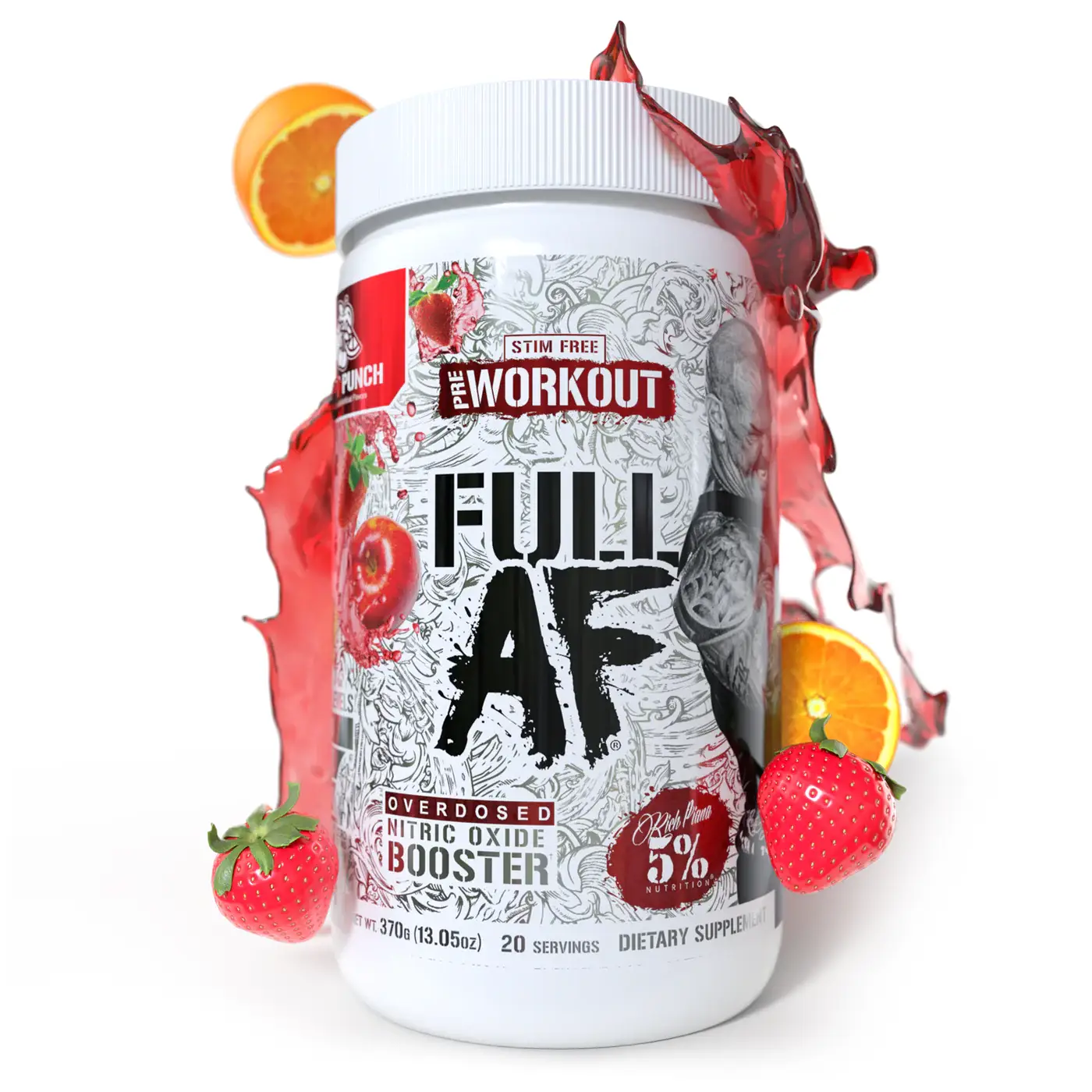FULL AF är en kompromisslös pre-workout för dig som vill ha extrem pump utan stimulantia. Den är framtagen av 5% Nutrition – Rich Pianas legendariska varumärke – med ett enda mål: att ge dig den mest brutala muskelvolymen du någonsin upplevt. FULL AF är helt fri från koffein, vilket gör den perfekt för kvällspass eller för dig som redan använder stim i andra produkter. Den är fullproppad med vetenskapligt stödda ingredienser som ökar kväveoxid, drar in vatten i musklerna och förbättrar uthållighet.