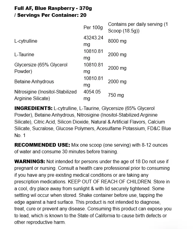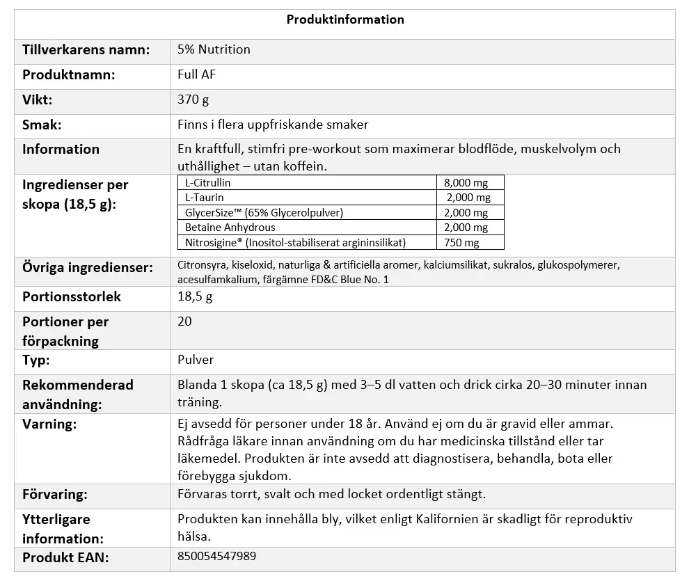 ✅ Full transparens – inga prop-blends: Du ser exakt vad du får. FULL AF är seriöst doserad och helt öppen med innehållet. Inga dolda blandningar, inga genvägar – bara ren, effektiv pre-workout.