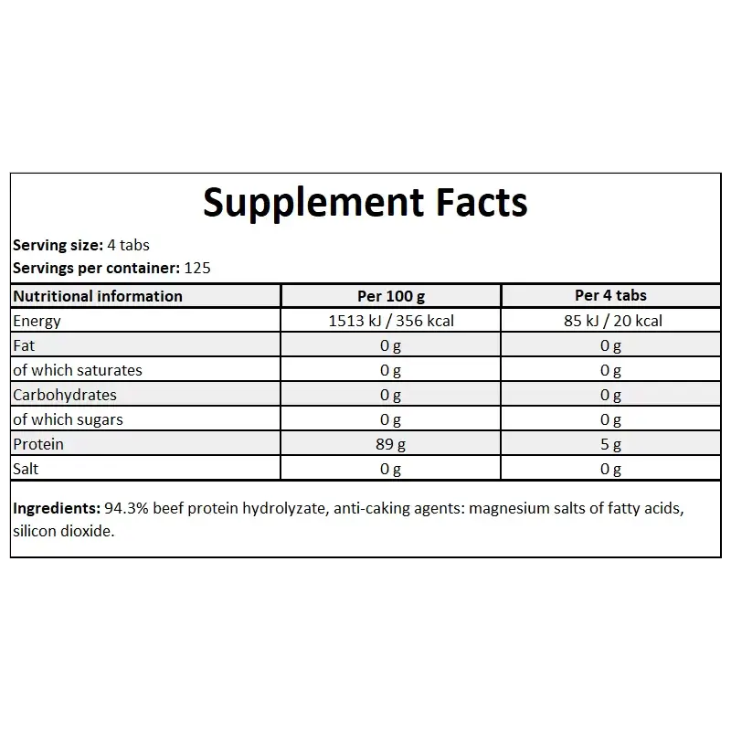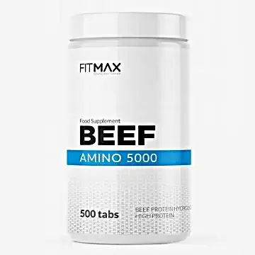 FitMax® Beef Amino 5000, tabletter, är en produkt som innehåller nötköttsproteinhydrolysat. Enzymatisk hydrolys av proteiner ger högkvalitativa, mycket smältbara peptider. Den ger en utmärkt bas av både endo- och exogena aminosyror med en riktigt hög biotillgänglighet. Produkten är främst avsedd för personer som är fysiskt aktiva, för att komplettera kosten med protein.