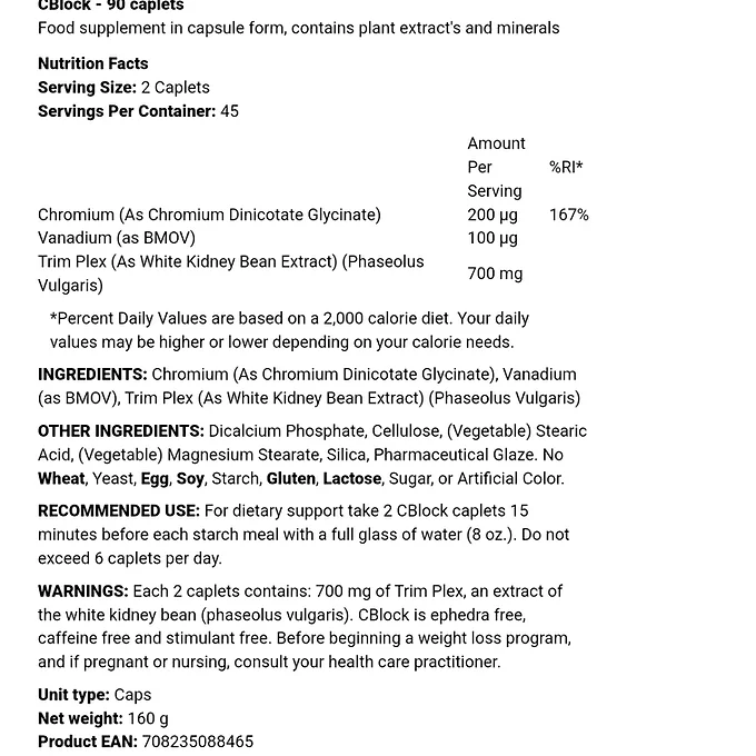 CBlock är en originalkolhydrathämmare som använder sig av Trim Plex, ett extrakt från den vita njurbönan (phaseolus vulgaris).