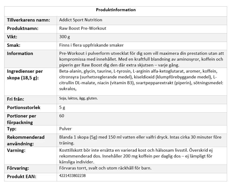 Ta din prestation till nästa nivå med Raw Boost. Med kraftfulla ingredienser och ren formula är det dags att känna skillnaden. Klicka hem din burk idag – och känn energin redan vid nästa pass!