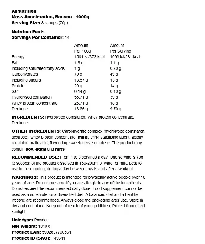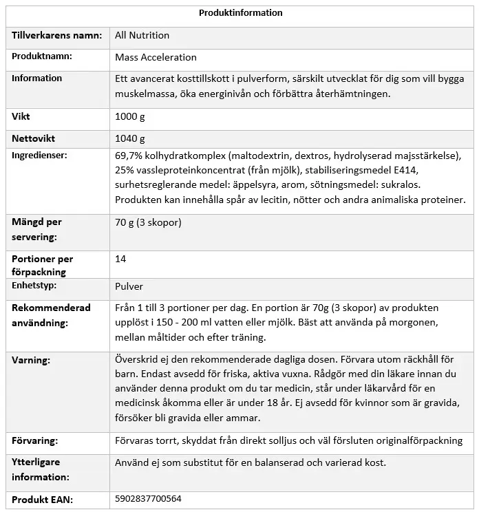 Med sin komplexa sammansättning av protein och kolhydrater, är Mass Acceleration ett smart val för dig som vill maximera muskeluppbyggnad, förbättra återhämtning och prestera på topp – varje dag.