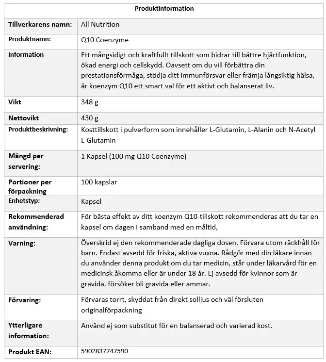Med upp till 100 mg koenzym Q10 per kapsel, är detta ett smart val för dig som vill stärka hjärthälsan, öka energin och skydda kroppen mot oxidativ stress – varje dag, hela vägen.