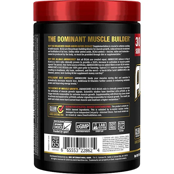 Aminocore BCAA från AllMax Nutrition är en muskelbyggande kraftpaket. BCAA (grenade aminosyror) spelar en avgörande roll för idrottare som strävar efter att bygga muskler. BCAA utgör de primära byggstenarna för muskeltillväxt och hjälper till att minska muskelnedbrytning samt underlätta fettförbränning. Vad som gör AllMax Aminocore så speciell är dess höga koncentration av BCAA i ett optimalt förhållande.