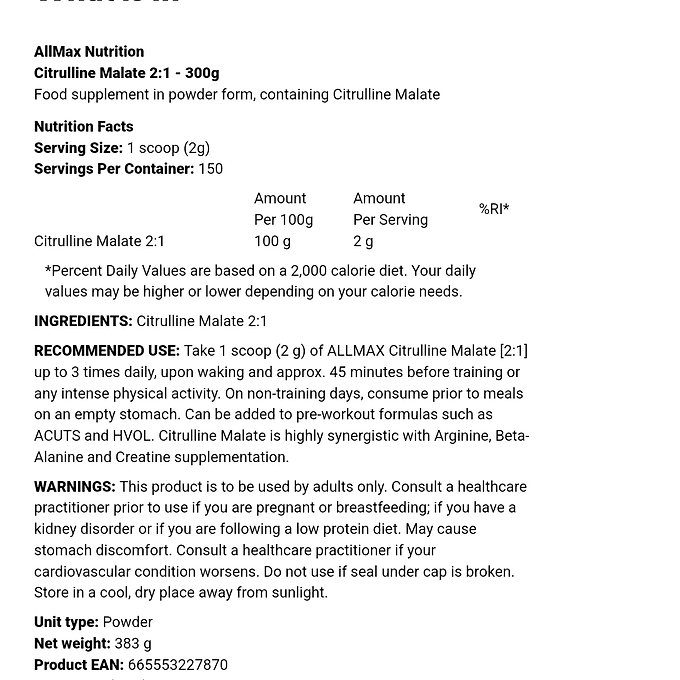 Maximera din träning med Citrulline Malate 2:1 från AllMax Nutrition, ökar blodflödet, motverkar muskelförsurning och återfyller energilagren i musklerna.