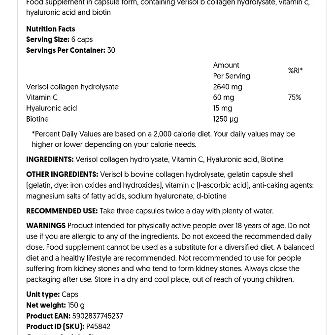 Hydrolyserat fiskkollagen vberikat med hyaluronsyra, vitamin C och biotin.