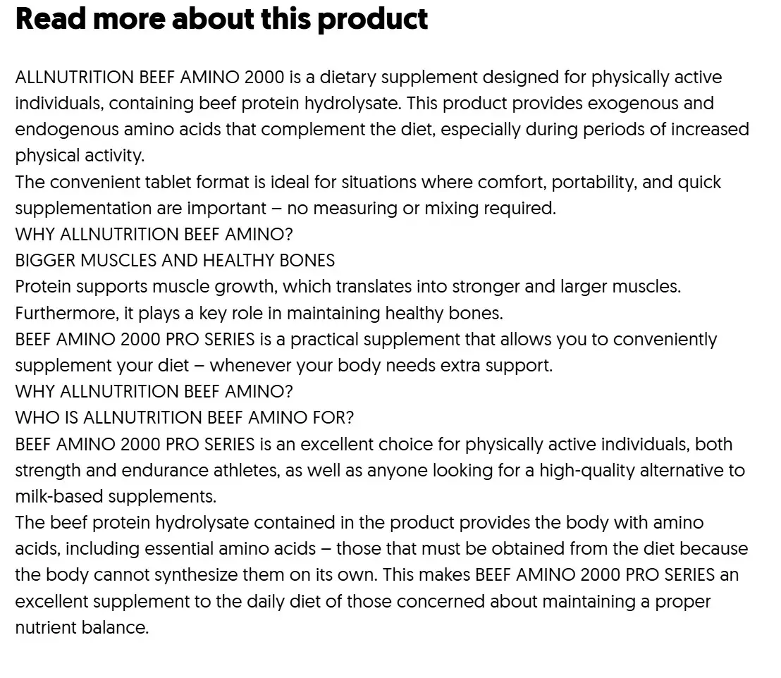 Allnutrition Beef Amino 2000 är ett kosttillskott i tablettform som innehåller hydrolyserat nötköttsprotein, vilket ger ett komplett spektrum av både essentiella och icke‑essentiella aminosyror. Produkten är framtagen för fysiskt aktiva personer som vill komplettera sin kost med lättupptagliga aminosyror, särskilt under perioder av intensiv träning eller ökad belastning. Tablettformatet gör den extremt praktisk – inget blandande, ingen kladd, bara snabb och enkel dosering.