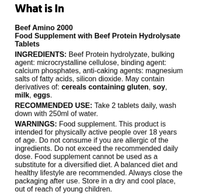 Ingredienser: Hydrolyserat nötköttsprotein, mikrokristallin cellulosa, kalciumfosfater, magnesiumsalter av fettsyror, kiseldioxid. Kan innehålla: gluten, soja, mjölk, ägg.