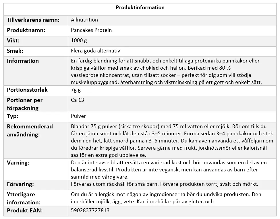 Allnutrition Pancakes Protein är särskilt framtagen för personer med en aktiv livsstil – såsom idrottare, gymbesökare och fitnessentusiaster – som har ett ökat behov av protein. Den passar även dig som följer en viktminskningsdiet och söker ett mättande, näringsrikt alternativ till vanliga pannkakor. För alla som vill leva hälsosamt och öka sitt dagliga proteinintag utan att kompromissa med smak är detta ett utmärkt val. Produkten är dock inte lämplig för veganer, eftersom den innehåller mjölkprotein och ägg.