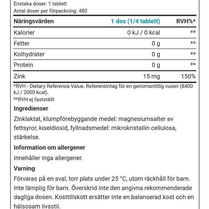upp till 15 mg zink per 1/4 tablett