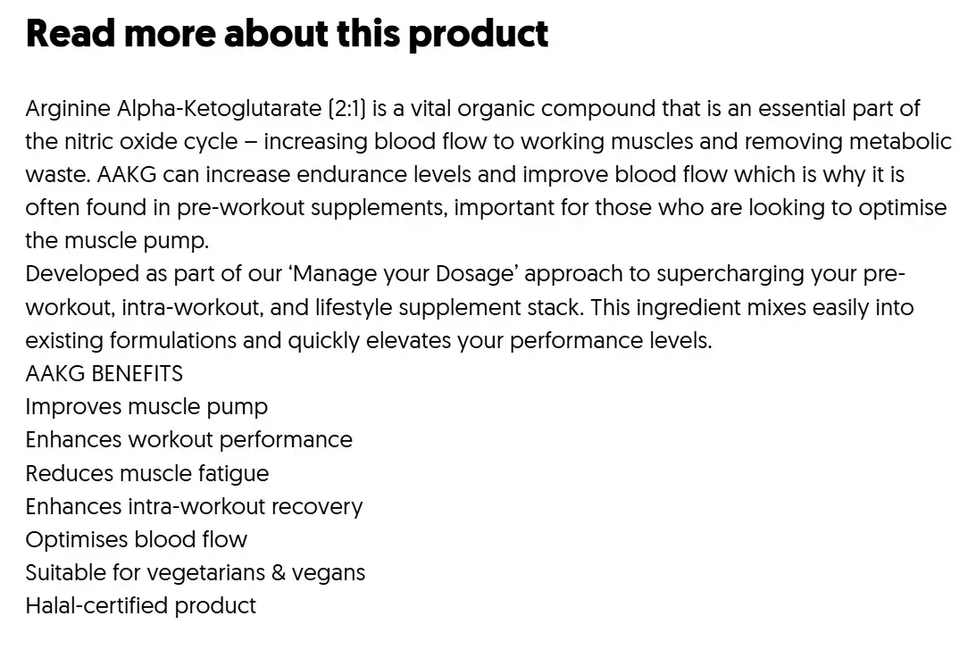 Produkten är utvecklad som en del av Applied Nutritions ”Manage Your Dosage”-koncept, vilket gör det enkelt att dosera AAKG separat eller kombinera det med andra pre‑workout‑ eller intra‑workout‑tillskott. Perfekt för dig som vill skräddarsy din träningsstack.
