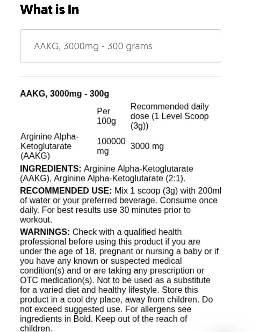 Applied Nutrition AAKG består av ren Arginine Alpha‑Ketoglutarate (2:1) – samma form som ofta används i avancerade pre‑workout‑produkter. Varje portion ger 3200 mg AAKG, vilket är en effektiv dos för att stödja pump, prestation och blodflöde.