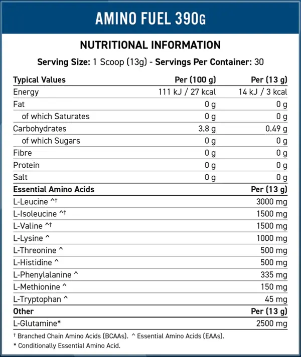 ✅ 9 g EAA + 6 g BCAA (2:1:1-ratio): Essentiella aminosyror (EAA) är avgörande för proteinsyntesen och måste tillföras via kosten. Amino Fuel innehåller 9 g EAA, inklusive 6 g BCAA i det optimala 2:1:1-förhållandet – vilket innebär att du får rätt mängd L-Leucin, L-Isoleucin och L-Valin för att maximera muskelreparation och tillväxt.