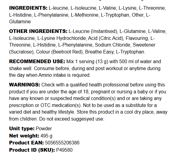 Blanda 1 skopa (13 g) med 500 ml vatten och skaka väl. Konsumeras före, under eller efter träning, eller när som helst under dagen när extra aminosyratillförsel behövs. Kan även användas som måltidsdryck eller för vätskeintag under dagen.