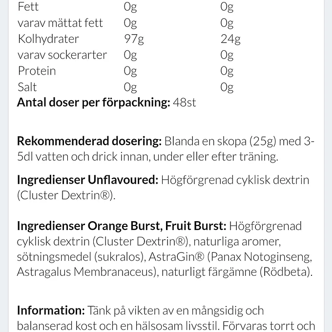 - Mycket lösliga kolhydrater + tillsatt 50 mg AstraGin
