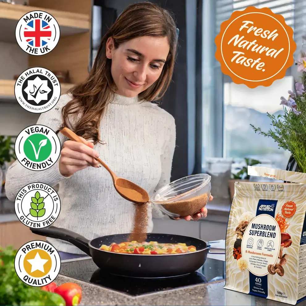 Mushroom Superblend från Applied Nutrition är ett kosttillskott i pulverform som innehåller extrakt från åtta av de mest näringsrika och funktionella svamparna: Lions Mane, Maitake, Chaga, Cordyceps Sinensis, Reishi, Shiitake, King Trumpet och Tremella. Denna unika blandning är utformad för att stödja din allmänna hälsa, immunitet och vitalitet. Pulvret är enkelt att använda och kan tillsättas direkt i smoothies, soppor, mat eller varma drycker – helt utan förberedelse.