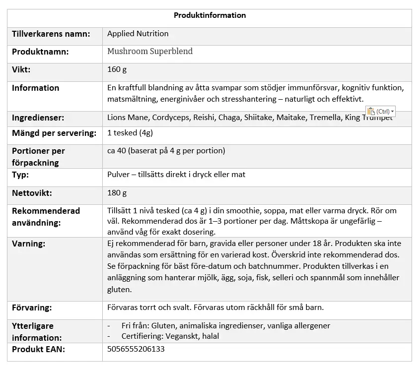 Bli först med att recensera ”Applied Nutrition – Mushroom Superblend 160g och 40 servering”