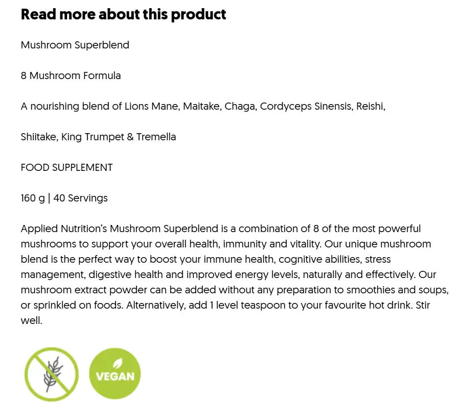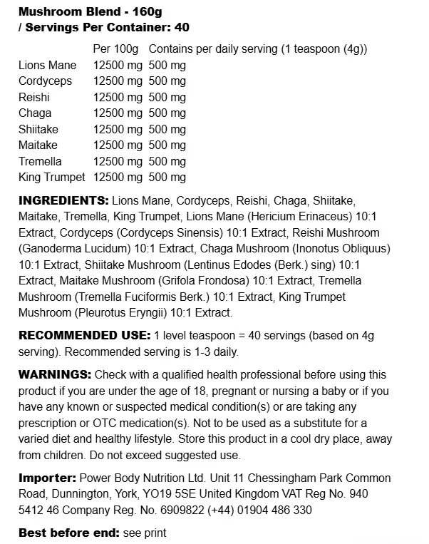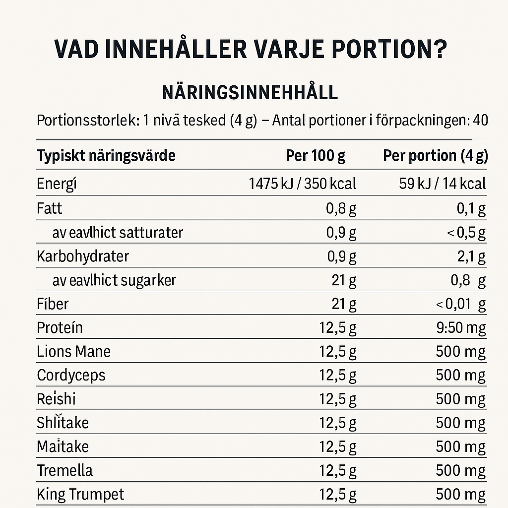 Förklarande text: Varje portion innehåller en nivå tesked (ca 4 g) av denna koncentrerade svampblandning. Extrakten är i 10:1-form, vilket innebär att varje gram pulver motsvarar 10 gram torkad svamp. Produkten är glutenfri, vegansk och halalcertifierad – och innehåller inga vanliga allergener.