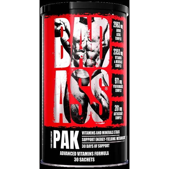 Tillägget innehåller 44 dospåsar. Bad Ass Pak 30 påsar är: Bekväm form av påsar, Vitaminkomplex, mineralkomplex, Viktigt för varje idrottare Stöd i att bygga muskelmassa.