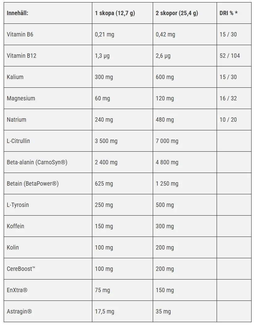 Rekommenderad daglig dos: Blanda 2 skopor (25,45 g) med 7 dl vatten och drick 20 – 30 minuter före träning. Överskrid ej rekommenderad daglig dos.