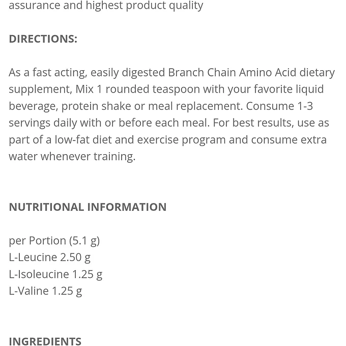 • 1 portion ger 5 g BCAA L-Leucin, L-Isoleucin och L-Valine