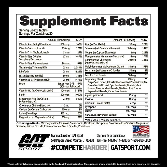 Mens Multi + Test – 60 Tabs från GAT är ett kosttillskott som ger vitaminer och mineraler + tribulus terrestris. Det finns mycket att vinna genom att äta med sunt förnuft och se till att variera din kost, med fokus på frukt och grönsaker.