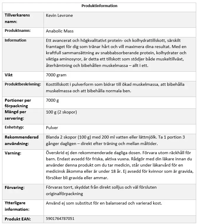 Kevin Levrone – Anabolic Mass tillverkas i en anläggning som även hanterar ingredienser som soja, ägg, jordnötter, nötter och gluten. Det är därför viktigt att du kontrollerar innehållet om du har allergier eller särskilda kostrestriktioner.