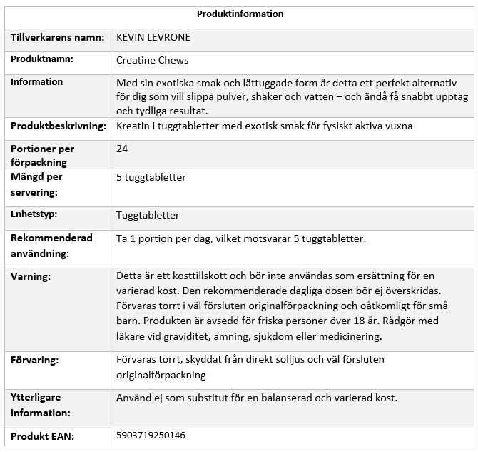 Levrone Gold Creatine Chews är ett innovativt kosttillskott för dig som vill ha kraftfull kreatineffekt i ett smidigt och gott format. Varje servering innehåller 5 gram kreatinmonohydrat, vilket är den dos som visat sig ge maximal effekt på fysisk prestation vid kortvarig, högintensiv träning.