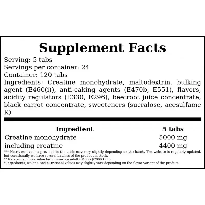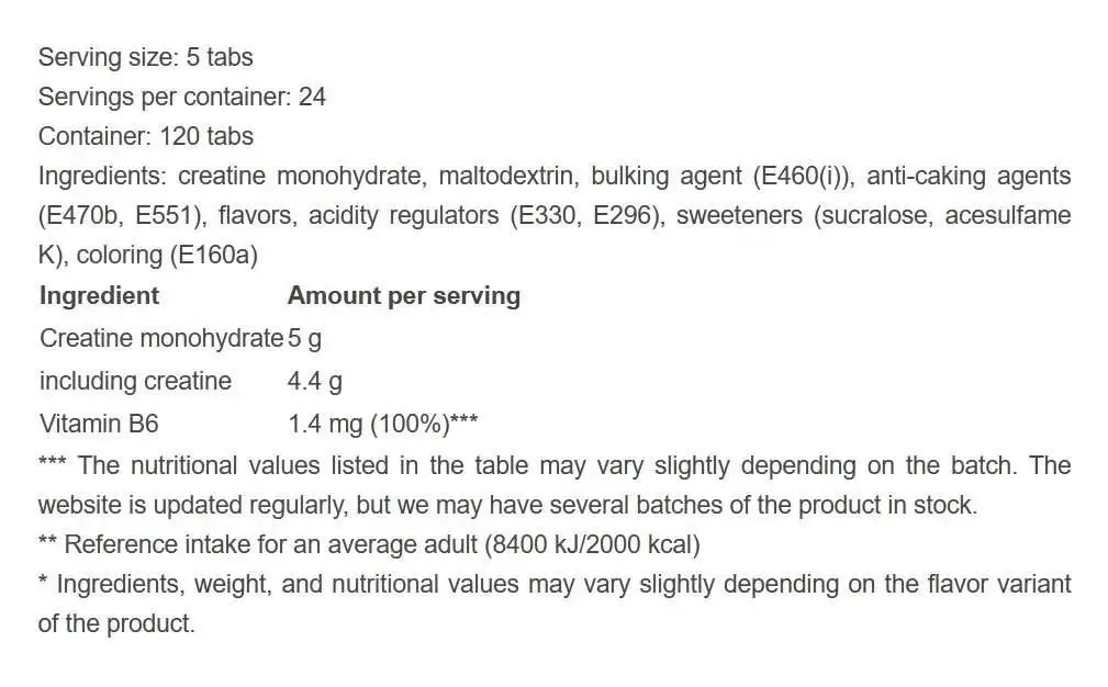Kreatinmonohydrat, maltodextrin, fyllnadsmedel (E460(i)), klumpförebyggande medel (E470b, E551), aromer, surhetsreglerande medel (E330, E296), sötningsmedel (sukralos, acesulfam K), färgämne (E160a).