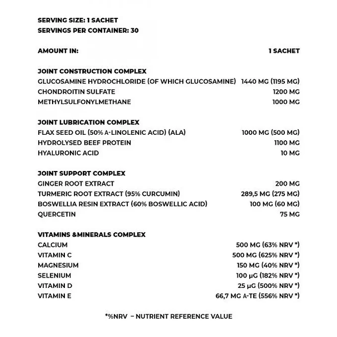 De många komponenterna i kombinationen levererar tillsammans de nödvändiga leveranserna för ens bindväv, höjer elasticiteten hos broskvävnaden, förser den med näring, fixar eventuell förstörelse, ökar mängden kollagen och höjer hastigheten för dess absorption.