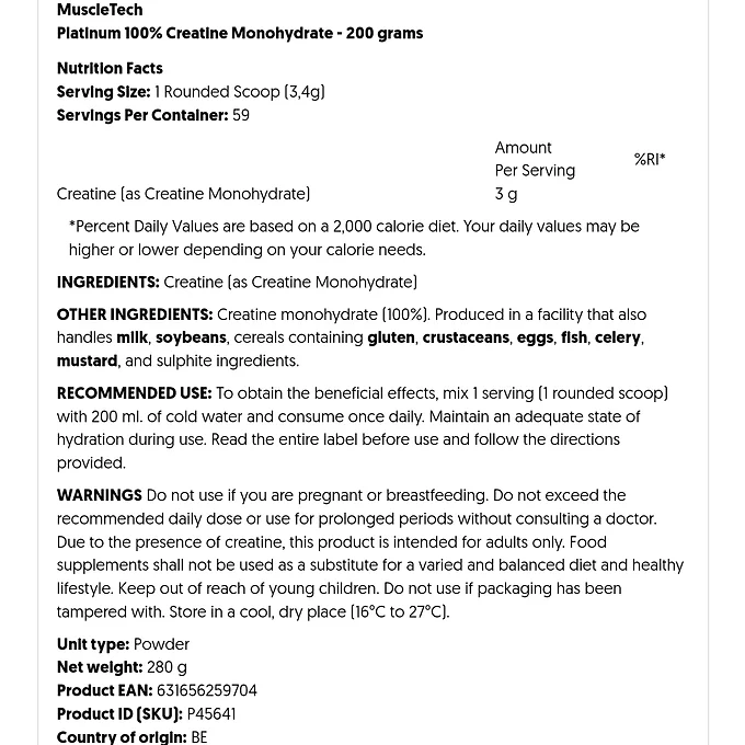 MuscleTech Platinum 100% Creatine Monohydrate ger den dagliga mängden kreatin (3 gram) som behövs för att öka fysisk prestation och muskelstyrka vid explosiva kraftansträngningar.