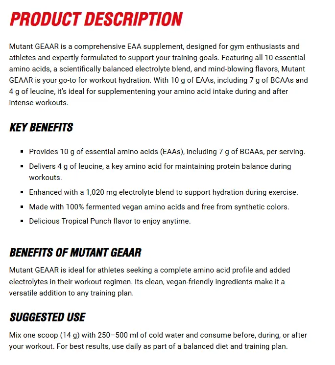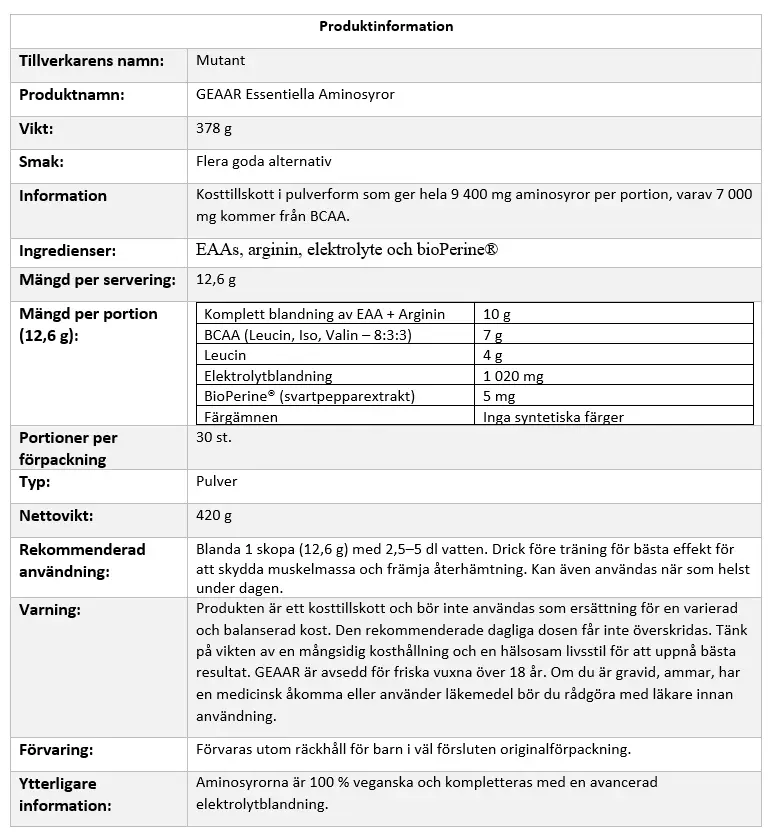 Mutant GEAAR är en avancerad aminosyraprodukt som innehåller essentiella aminosyror (EAA), där en stor del utgörs av BCAA. Alla aminosyror har vegetabiliskt ursprung för att maximera löslighet och kvalitet. Produkten är förstärkt med en elektrolytblandning som bland annat innehåller magnesium, vilket bidrar till elektrolytbalansen. GEAAR är utformad för att användas när som helst under dagen, men Mutant rekommenderar att den tas före träning.
