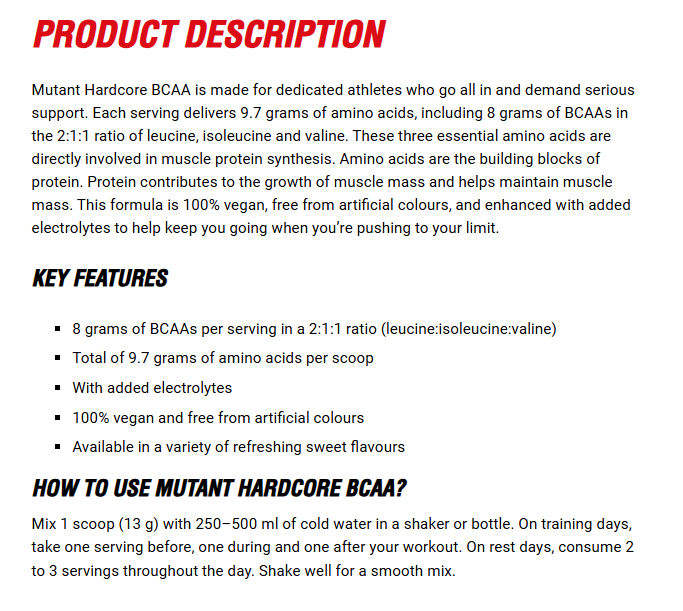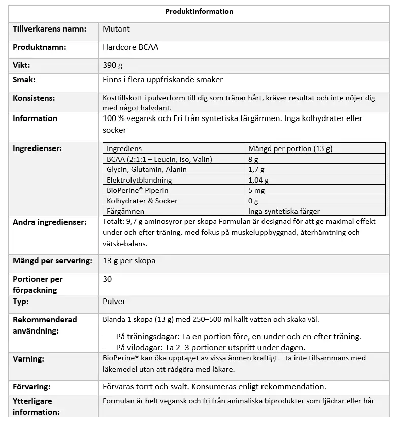 Mutant Hardcore BCAA är ett avancerat BCAA- och elektrolyttillskott för seriösa atleter som vill maximera sin prestation, skydda muskelmassan och återhämta sig snabbare. Med 100 % veganska fermenterade aminosyror, en kraftfull elektrolytblandning och en patenterad absorptionsbooster är detta ett av de mest potenta BCAA-tillskotten på marknaden.