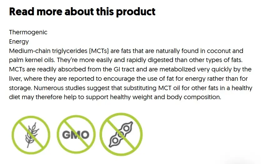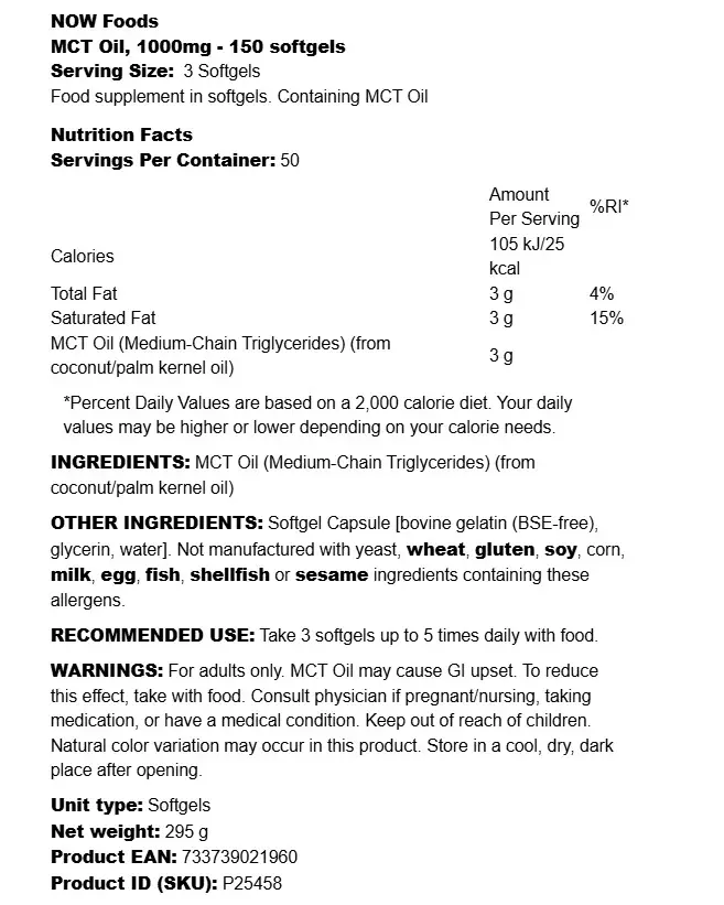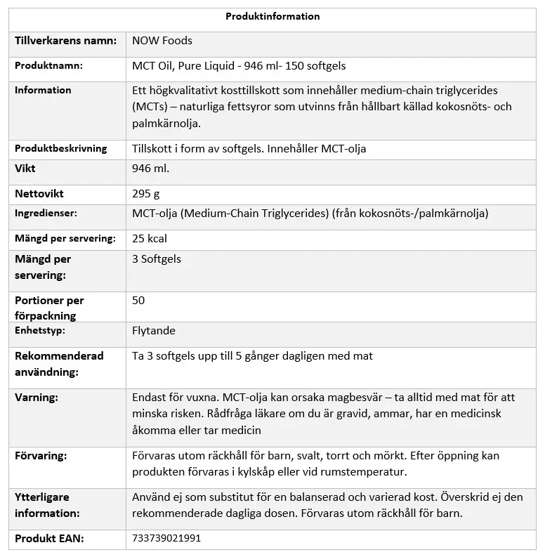 Källor: Kokosnöts- och palmkärnolja. Inga övriga ingredienser i flytande version. Softgels innehåller kapselmaterial: nötkreatin, glycerin, vatten.