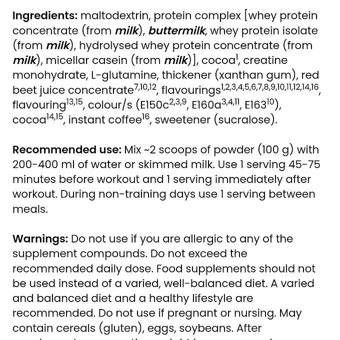 Förbrukning: ~ 2 gauge pulver (100 g) blandat med 200-400 ml vatten eller mager mjölk. Ta 1 portion 45-75 minuter före ditt träningspass och 1 portion direkt efter träningen. Använd 1 portion mellan måltiderna under träningsdagarna.