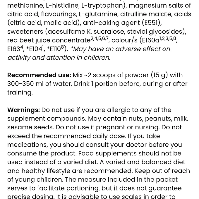 Förbrukning: Blanda ~ 2 gauge pulver (15 g) med 300-350 ml vatten. Ta 1 portion före, under eller efter träningen.