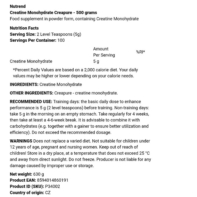 Med NUTREND’s Creatine Monohydrate Creapure kan du säkerställa att dina kreatinnivåer är optimala för att möta de krav som högintensiv träning ställer. Creapure är ett varumärke som garanterar en extremt ren form av kreatinmonohydrat. Detta innebär att varje portion av produkten ger dig högkvalitativt kreatin utan onödiga tillsatser eller föroreningar.