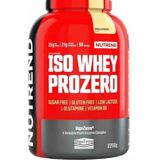 Nutrend Iso Whey Prozero-Vassleproteinisolat / CFM-vassleisolat berikat med L-glutamin, vitamin B6 och matsmältningsenzymer.