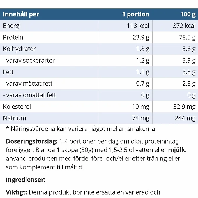 Proteinpulvret har en hög halt av protein, men denna kan variera något mellan de många olika smakerna. Du kan dock räkna med att få en proteinhalt på mellan 79 – 82 % protein oberoende av vilken smak du väljer. Tack vare att detta vassleproteinpulver är instantiserat löser det sig också enkelt i vätska, vilket gör att du slipper klumpar i din proteinshake.