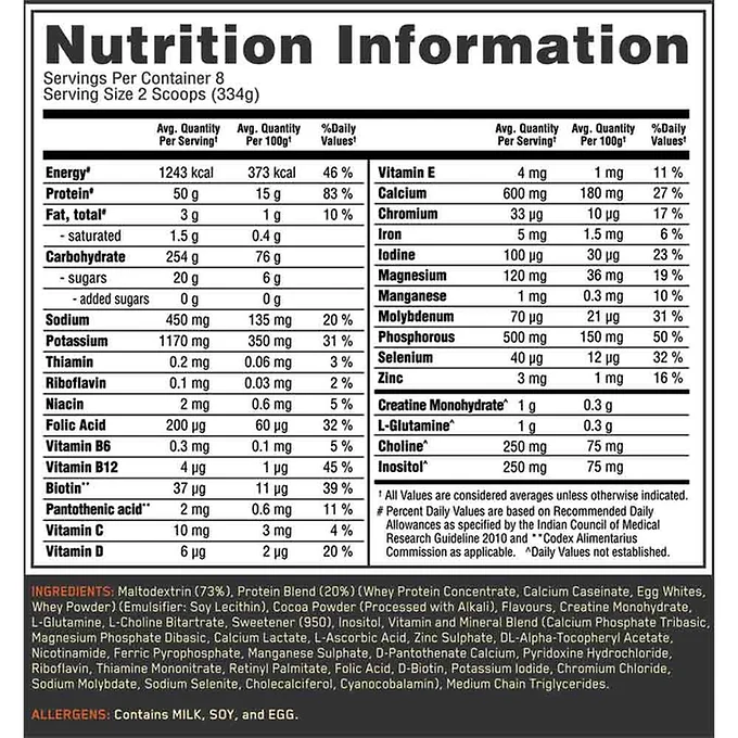 Serious Mass från Optimum Nutrition är då ett utmärkt alternativ som ger dig över 1250 kcal, 250 gram kolhydrater och 50 gram protein av hög kvalitet vid varje portion.