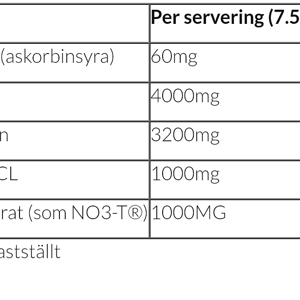 Ingredienser: L-citrullin, Beta Alanin, Kreatin HCL, Arginin nitrat (som NO3-T®), Vitamin C (askorbinsyra)