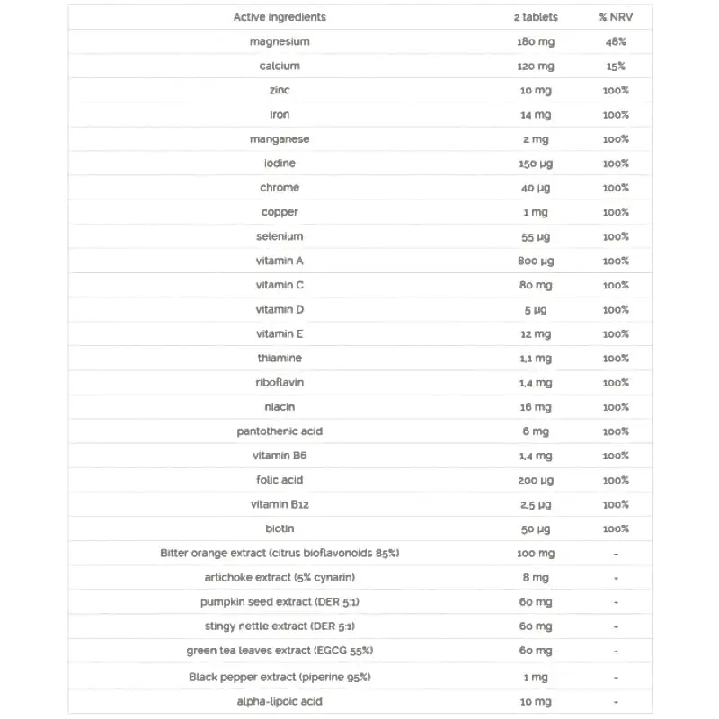 Max Complete är ett fantastiskt kosttillskott från Real Pharm, tack vare vilket du förebygger vitamin- och mineralbrister. Som du vet får din kropp de flesta vitaminer från maten, så det är värt att se till att kosten är ordentligt balanserad. Men det räcker inte alltid med mat. Termisk bearbetning av livsmedel orsakar en minskning av vitaminvärdet i en viss produkt och följaktligen en minskad tillförsel av vitaminer och mineraler. Detta är en snabb väg till brist, vilket kommer att försämra vår hälsa avsevärt. Real Pharm Max Complete syftar till att förhindra en sådan situation. Det är kraften av vitaminer och mineraler berikad med naturliga växtextrakt. Allt detta i form av små tabletter som är lätta att svälja.