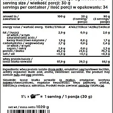 Vassleproteinisolat med högt biologiskt värde Nästan 30 g WPI per portion utan tillsats av andra fraktioner Hjälper till att bygga upp styrka och muskelmassa