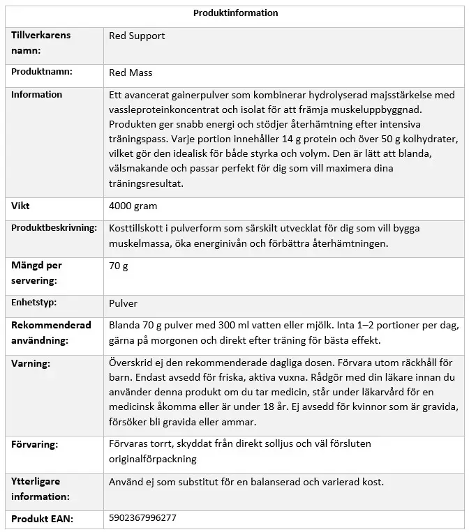 Red Mass från Red Support är ett kraftfullt kosttillskott i pulverform. Först och främst är det särskilt utvecklat för dig som vill bygga muskelmassa. Dessutom hjälper det till att öka energinivån, vilket gör att du kan prestera bättre under träning. Slutligen bidrar det till att förbättra återhämtningen, så att du snabbare kan komma tillbaka och fortsätta utvecklas. Med en balanserad sammansättning av hydrolyserad majsstärkelse, vassleproteinkoncentrat och vassleisolat, ger Red Mass kroppen de byggstenar den behöver för att prestera på topp – både under och efter träning.