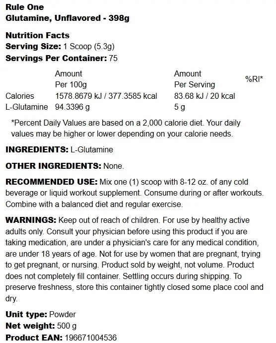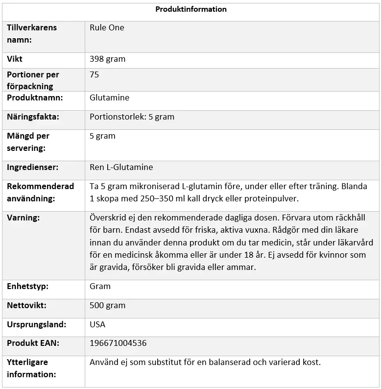 Ta 5 g mikroniserad L-glutamin före, under eller efter träning. Blanda 1 skopa med 250–350 ml kall dryck eller proteinpulver.