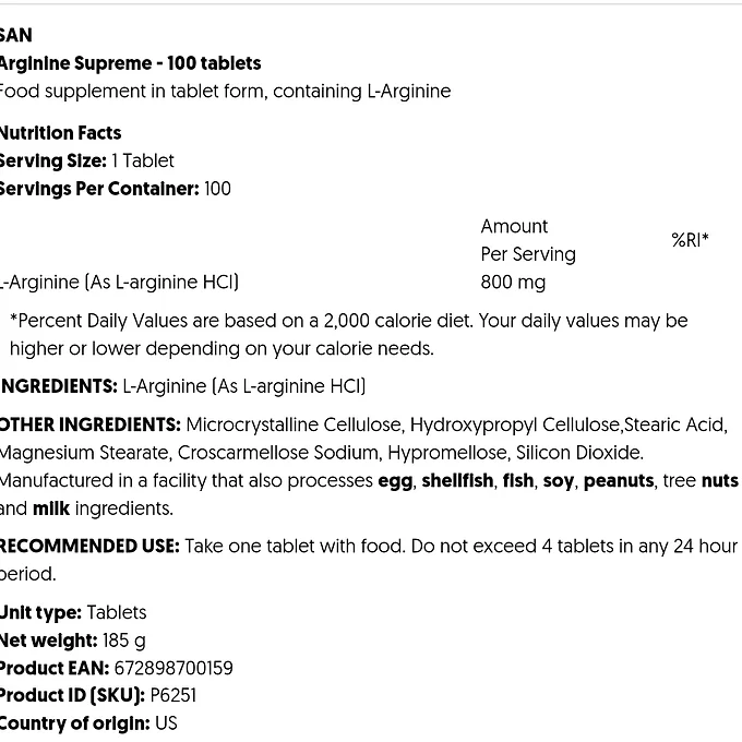 Få mer muskelmassa och snabbare återhämtning med SAN – Arginine Supreme. Varje tablett innehåller 800 mg L-arginin för att främja proteinsyntesen och muskeltillväxten. Ta en tablett dagligen för att maximera resultaten.