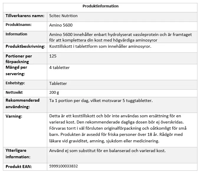 AMINO 5600 från Scitec Nutrition är en komplett aminosyraformel i tablettform, utvecklad för dig som vill ge kroppen ett effektivt tillskott av essentiella och grenade aminosyror (BCAA) – utan att behöva blanda pulver. Produkten är baserad på hydrolyserat vassleprotein, vilket innebär att aminosyrorna redan är nedbrutna och redo att absorberas snabbt av kroppen.