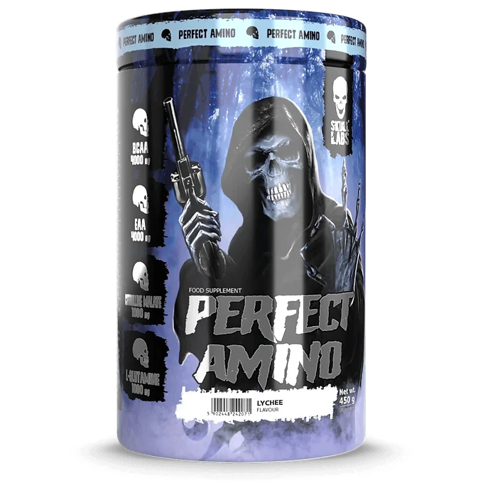 SKULL LABS® PERFECT AMINO. Kosttillskott. Med sötningsmedel. Aminosyraformel före/efter träning, designad för att styrketräna idrottare och fysiskt aktiva personer.