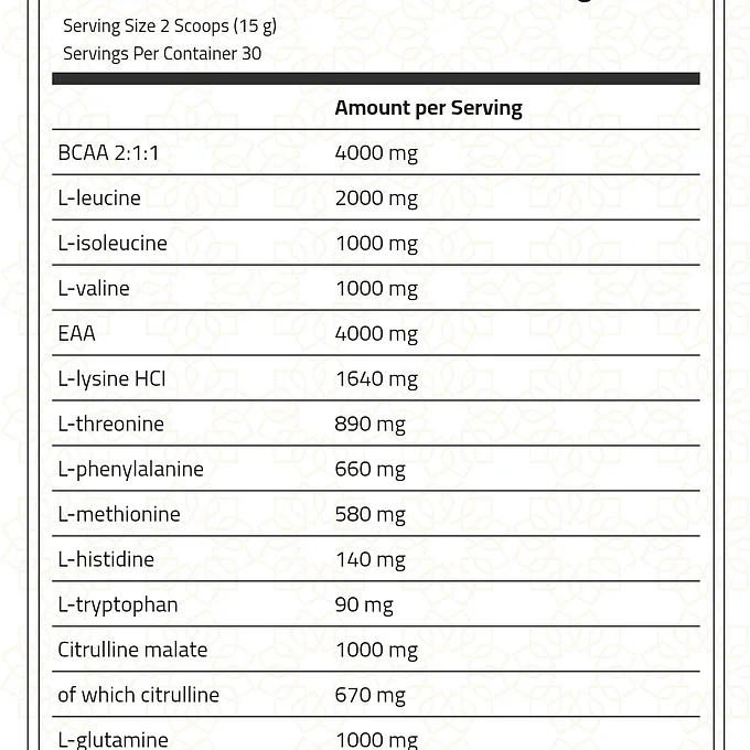 Ingredienser: Aminosyrakomplex (L-leucin, L-isoleucin, L-valin, L-lysin HCl, L-treonin, L-fenylalanin, L-metionin, L-histidin, L-tryptofan), magnesiumcitrat, aromer, L -glutamin, citrullinmalat, syror (citronsyra, äppelsyra), antiklumpningsmedel (E551), sötningsmedel (acesulfam K, sukralos, steviolglykosider), rödbetsjuicekoncentrat2,4,5,6,7, färg/färger (E160a1,2,3,5,8, E1634, *E1041, *E1108). *Kan ha en negativ effekt på aktivitet och uppmärksamhet hos barn.