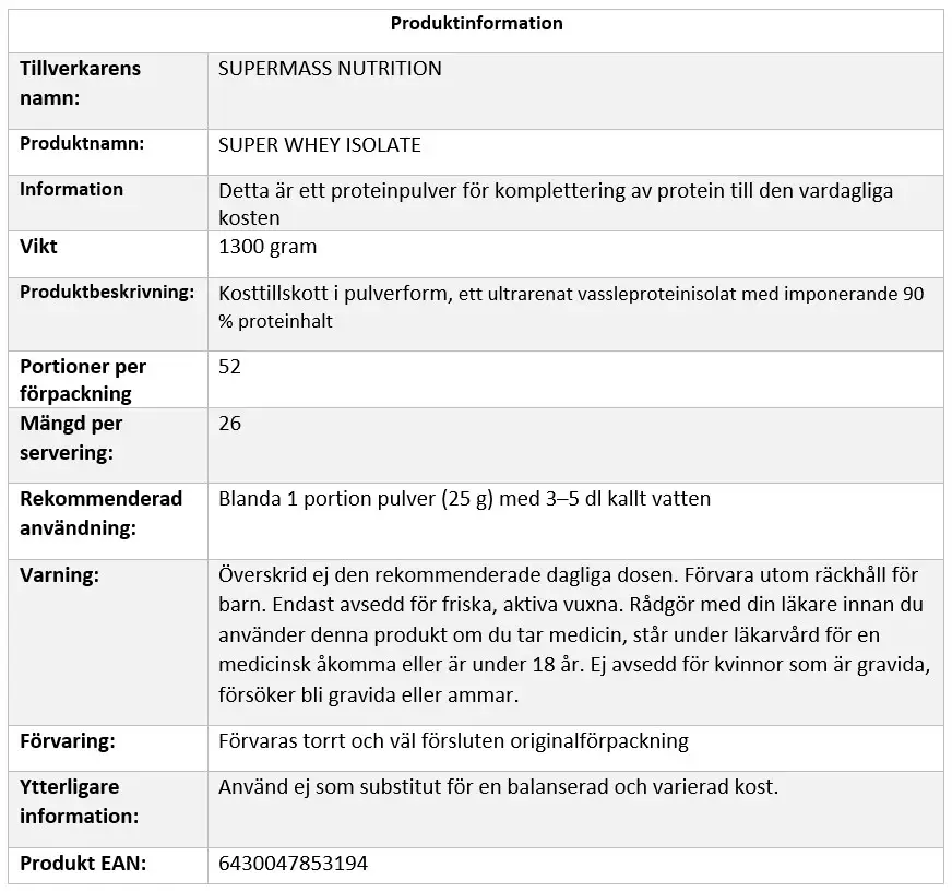 Super Whey Isolate från Supermass Nutrition är ett ultrarenat vassleproteinisolat med imponerande 90 % proteinhalt som ger en ren, kraftfull proteinkälla med minimalt fett och kolhydrater. Med sin ultrafiltrerade sammansättning och utsökta smaker är det självklara valet för den seriösa atleten! Den sätter en helt ny standard för proteinpulver med sin innovativa formula och sagolika smaker. Perfekt för dig som vill ha det absolut bästa inom protein. Högkvalitativ formula för optimal muskeluppbyggnad och återhämtning